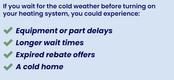 Testing your heating system is quick, easy and will keep your family warm and cozy when it matters.